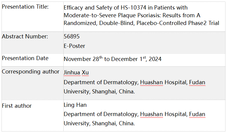 The presentation reports the Phase II clinical trial results. HS-10374 showed significant clinical efficacy versus Placebo (PBO) in terms of PASI 75 response rate and sPGA 0/1 response rate with oral doses of 6 mg QD or 12 mg QD in patients with moderate-to-severe plaque psoriasis. The overall safety profile was similar to other TYK2 inhibitors, as adverse events of“skin and subcutaneous disorders” in this study were more commonly reported in PBO group. Ongoing Phase 3 Trial (CTR20243822) with a longer treatment duration and larger populations will further confirm the efficacy and safety of HS-10374 (12mg QD)in such patients.
